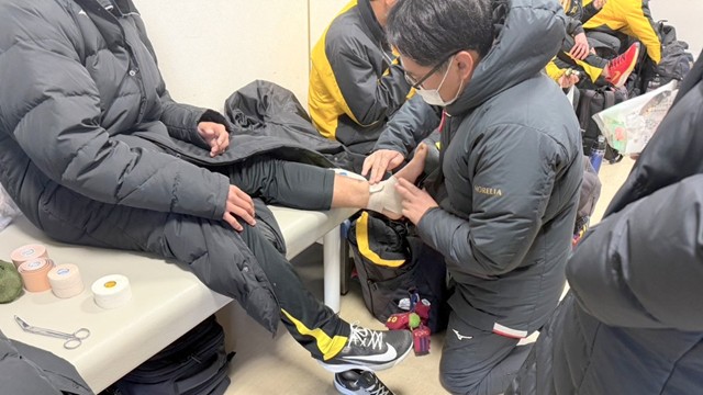 帯同時には伊藤超短波株式会社様より治療機器のご支援もいただき、宿泊先で選手のケアを、試合ではテーピングや救急対応を行いました。